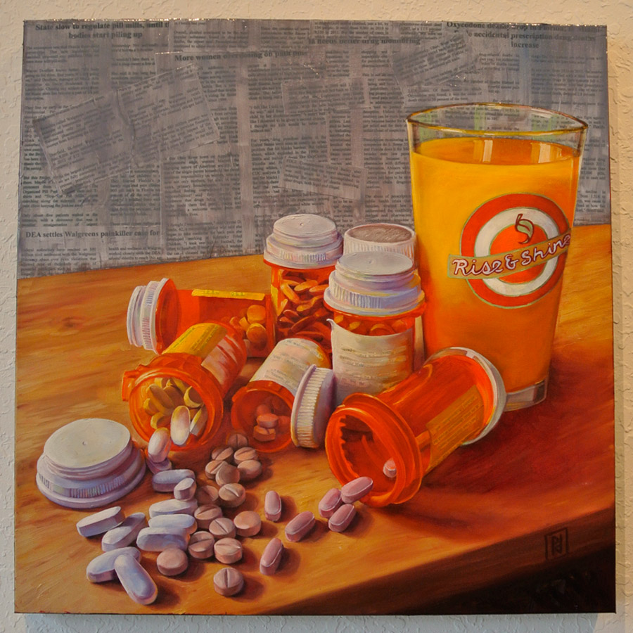 | A BALANCED BREAKFAST Perry deVick Oil & Collage on Canvas 2' x 2' |