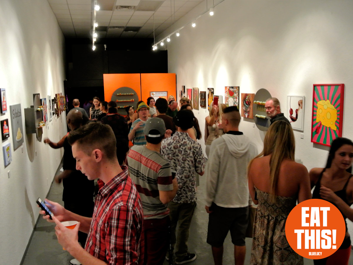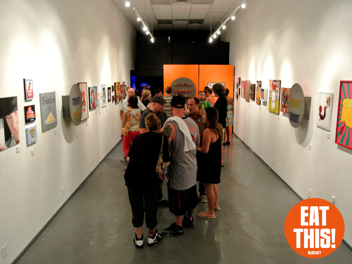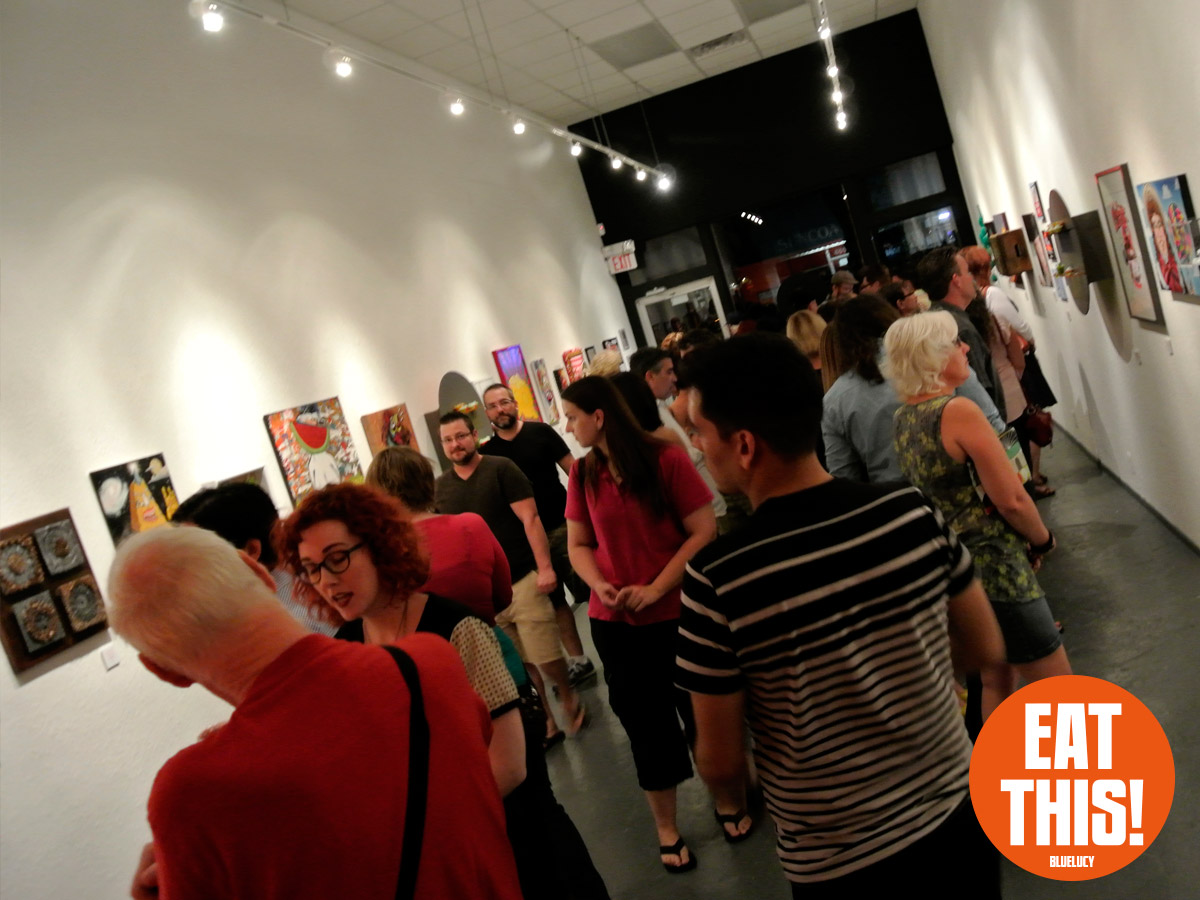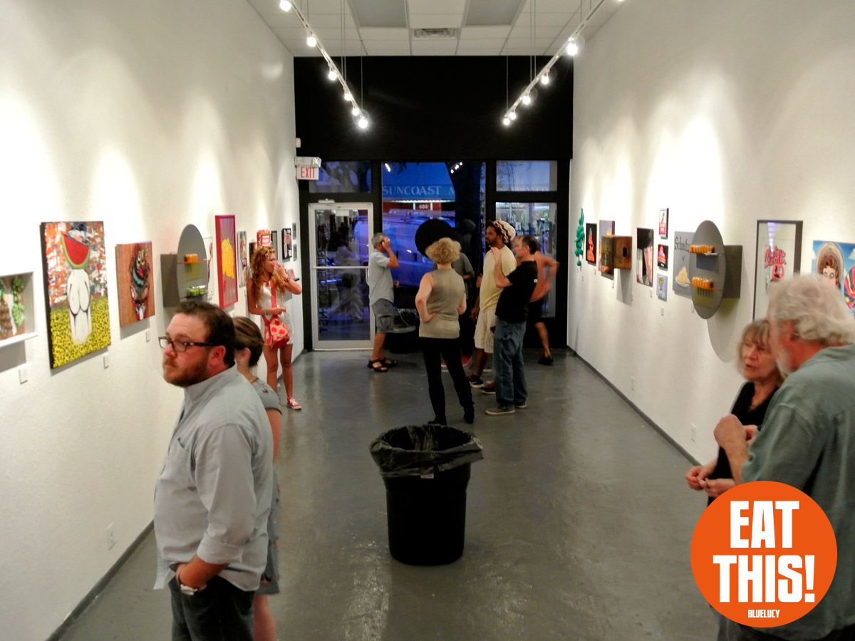 EAT THIS! The Art of Food Exhibit. Participating artists: Tonny Ayers, Brandon Bailey, Julie Brookins, Kristi Leigh Capone, Theresa Crout, Coralette Damme, Amanda Dawson, Perry deVick, Demeree, Jessi Donnelly, Todd Frain, Dominice Gilbert, Joshua Haynes, Eric Kent, Rebekah Lazaridis, Joanna Ledingham, Anna Luther, Carrie Matteoli, James Michael McCracken, Sharon Norwood, James Oleson, Taylor Pilote, Zos Pistola, Gabriel Ramos, Robert X. Rules, Jeremy Tollberg, Julia Updegraff, Vegetable, Bob Vieira, Jamison Waddell, Ceri Watkins, Jameson Wilkins, and Sue Woodall. Delectable treats by EAT THIS! Bluelucy Gallery • 653 Central Avenue • St Petersburg FL 33701